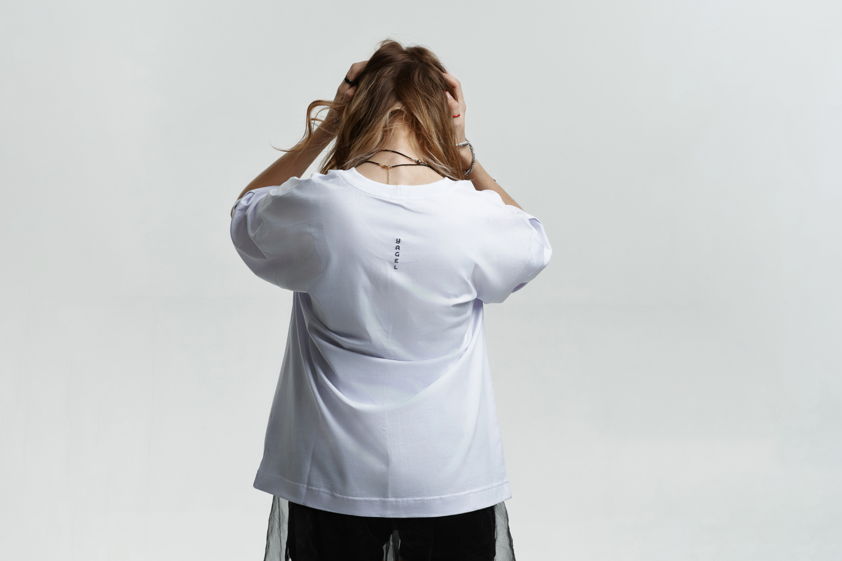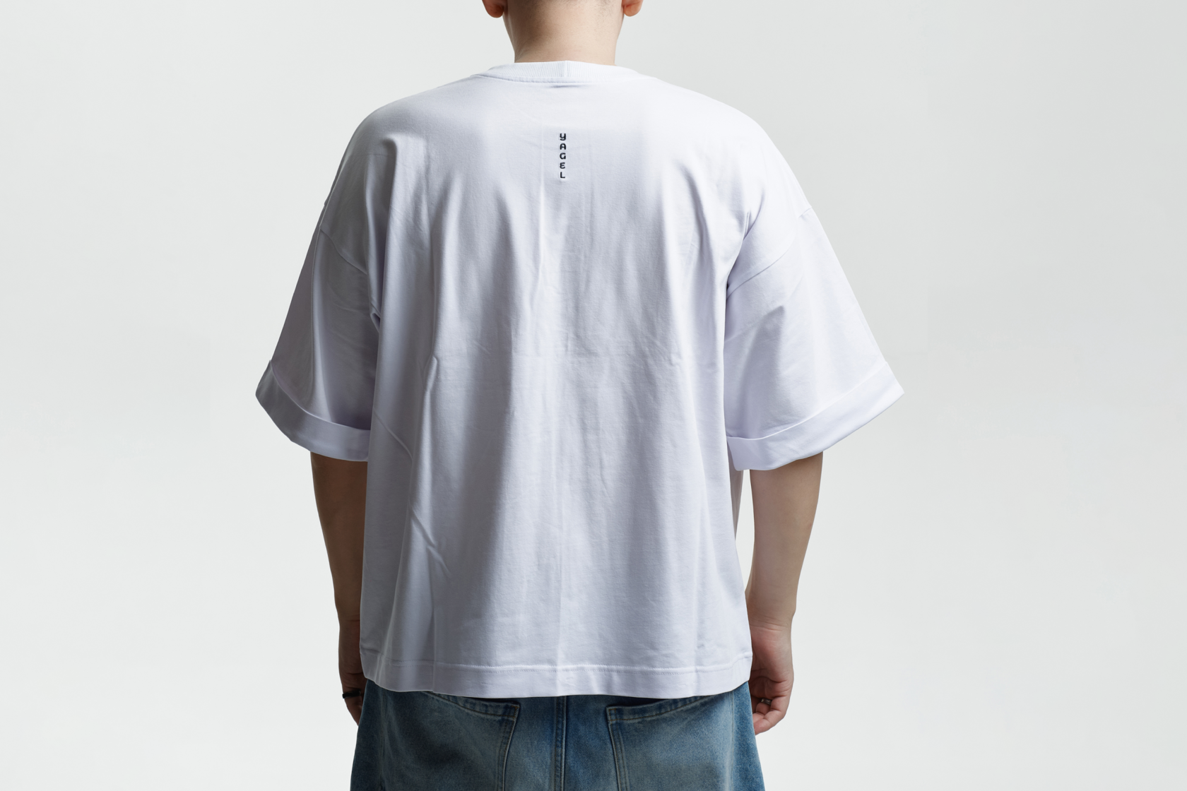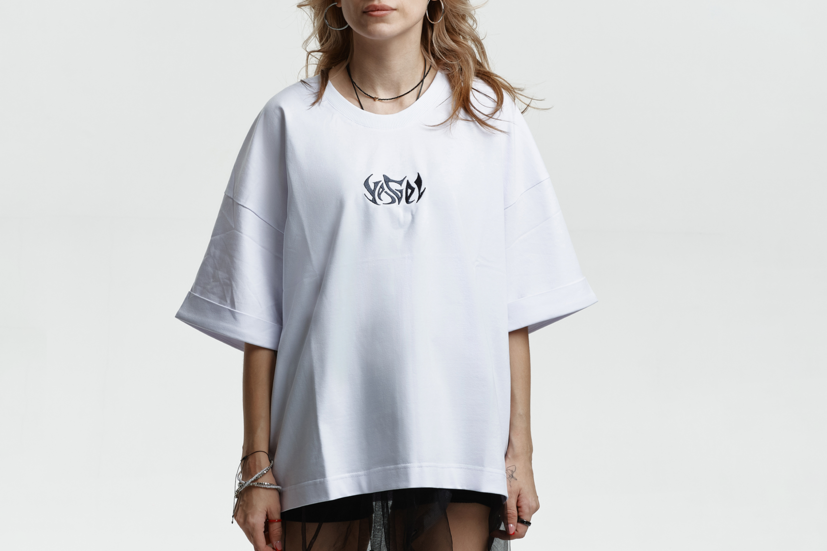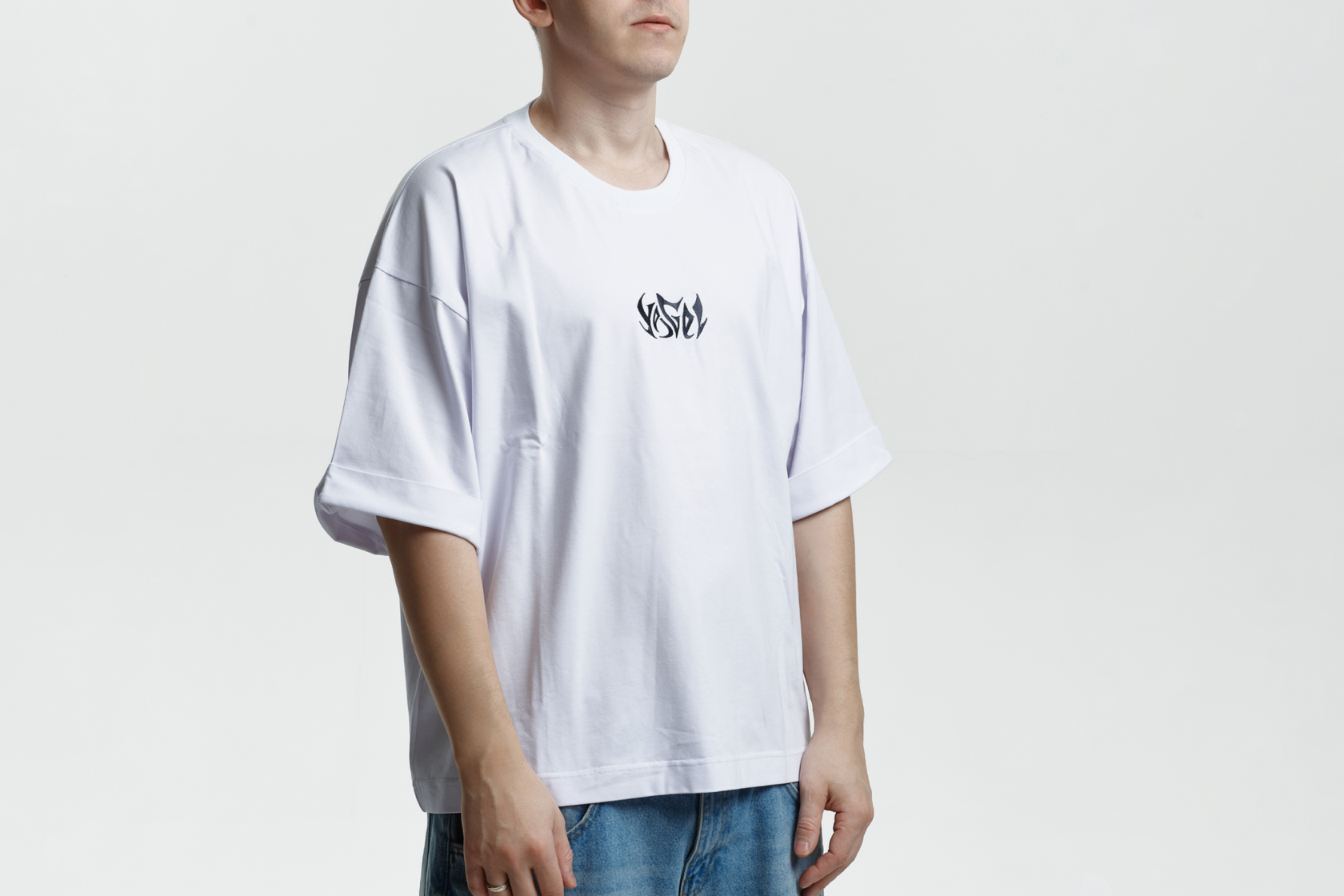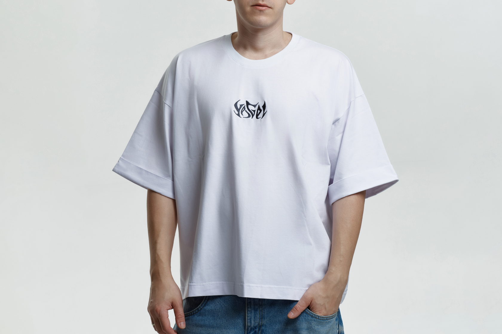 Белая футболка с чёрной вышивкой — та самая база, которая нужна каждому. Чистый фон и контрастный логотип YAGEL в центре делают её универсальной частью гардероба.