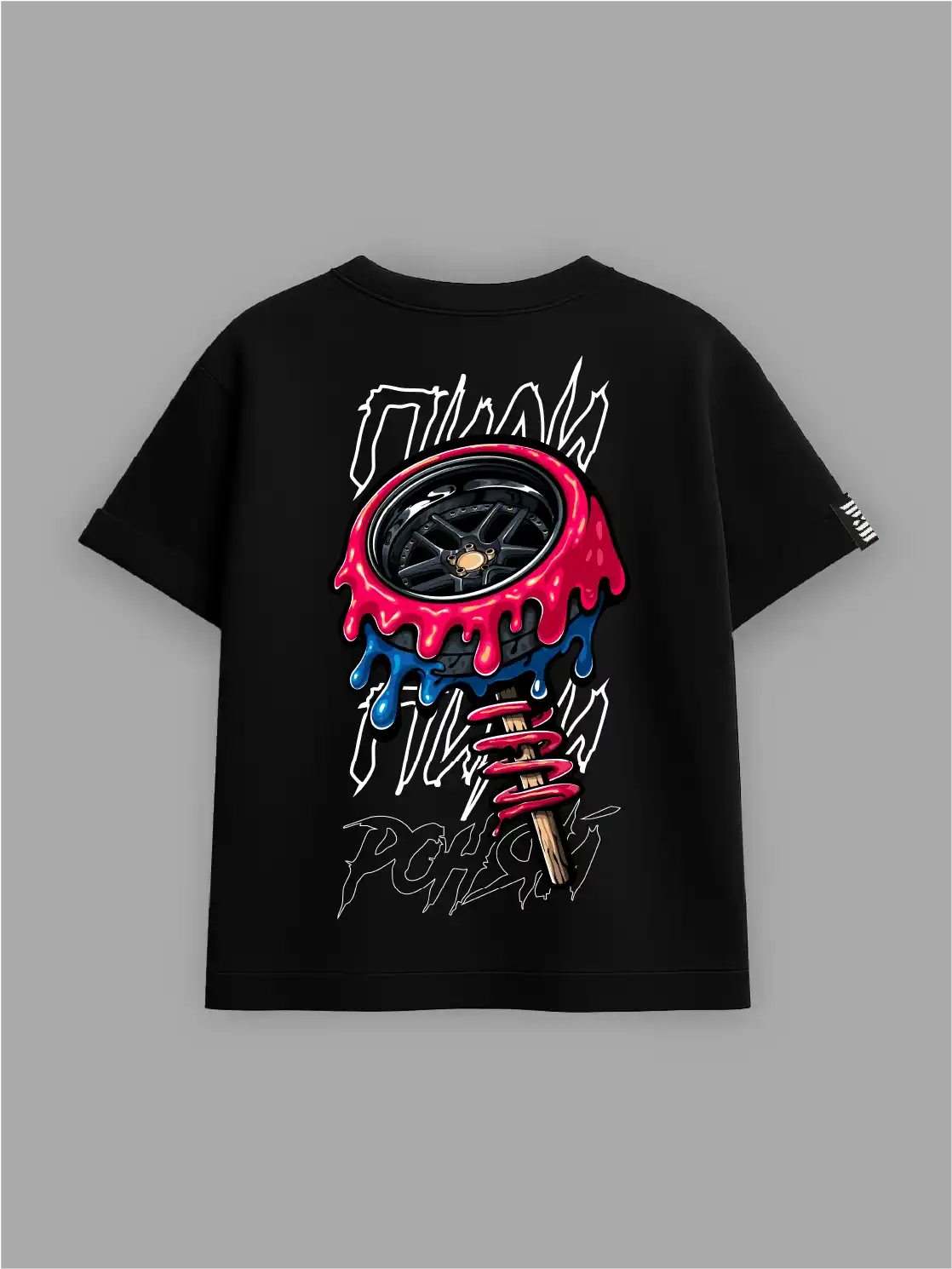 – Изображение: автомобильное колесо с кайловером — капающим «тающим» мороженым, и динамичная каллиграфия «Пили Роняй».