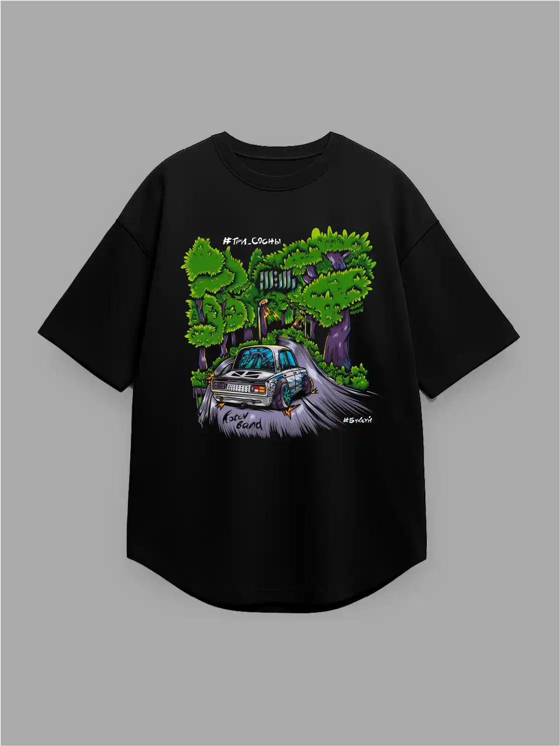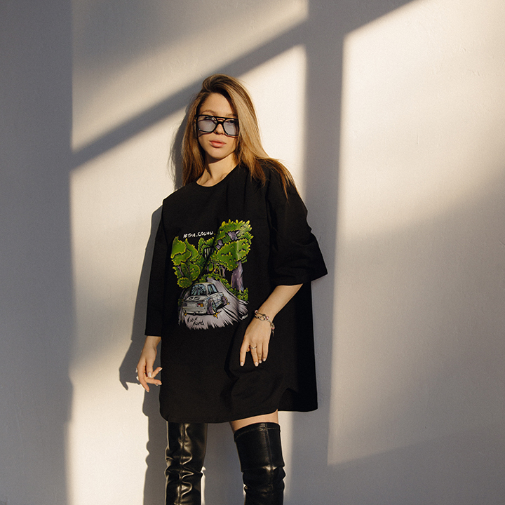 – Воротник из рибаны (плотный ребристый трикотаж) — держит форму и не растягивается. Принт DTF (direct-to-film) — стойкий и яркий: не трескается и не выцветает. Аккуратные двойные швы по подолу и рукавам.