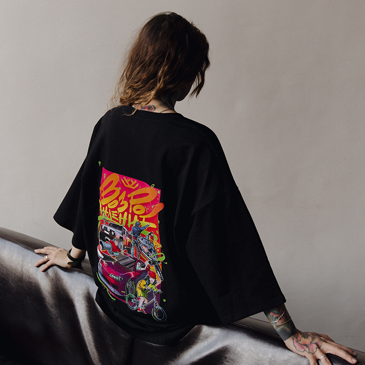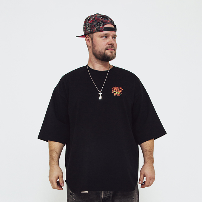 – Воротник из рибаны (плотный ребристый трикотаж) — держит форму и не растягивается. Принт DTF (direct-to-film) — стойкий и яркий: не трескается и не выцветает. Аккуратные двойные швы по подолу и рукавам.