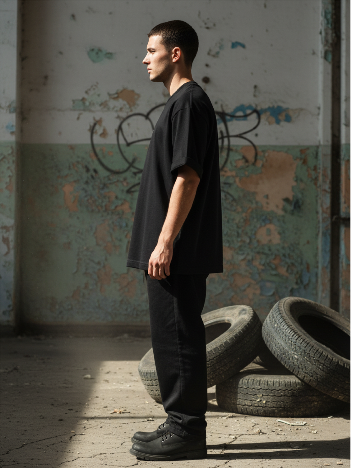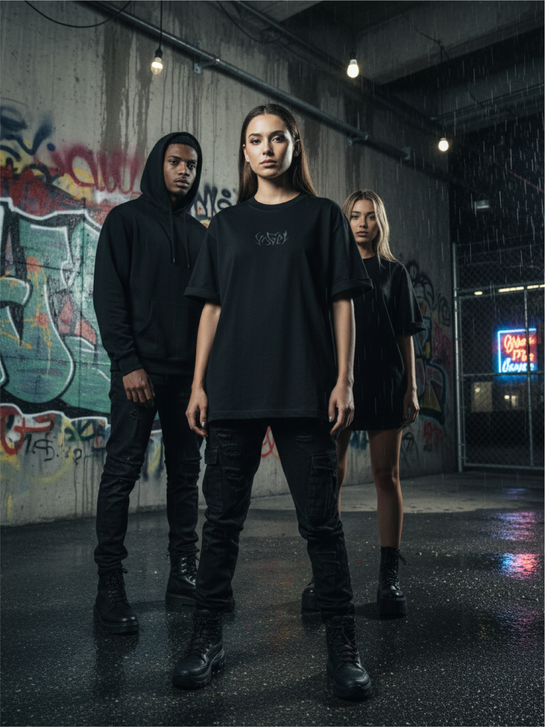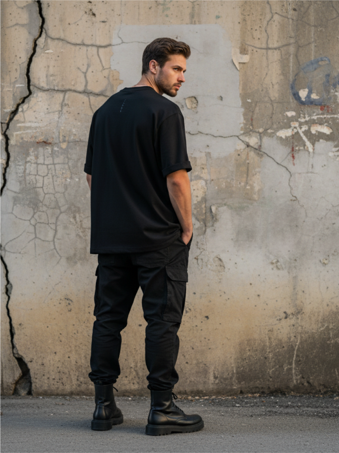 Чёрная ткань и чёрная вышивка — почти тон в тон. Минимализм, который работает на близкой дистанции: логотип появляется в свете и движении, как скрытая метка.