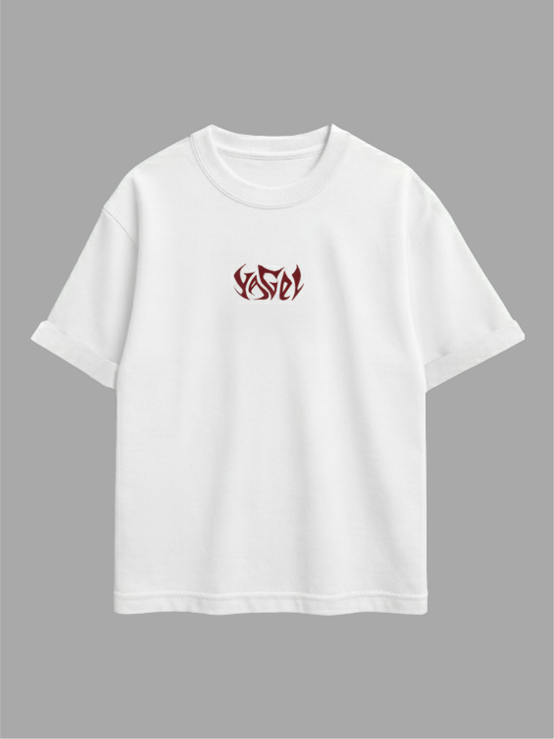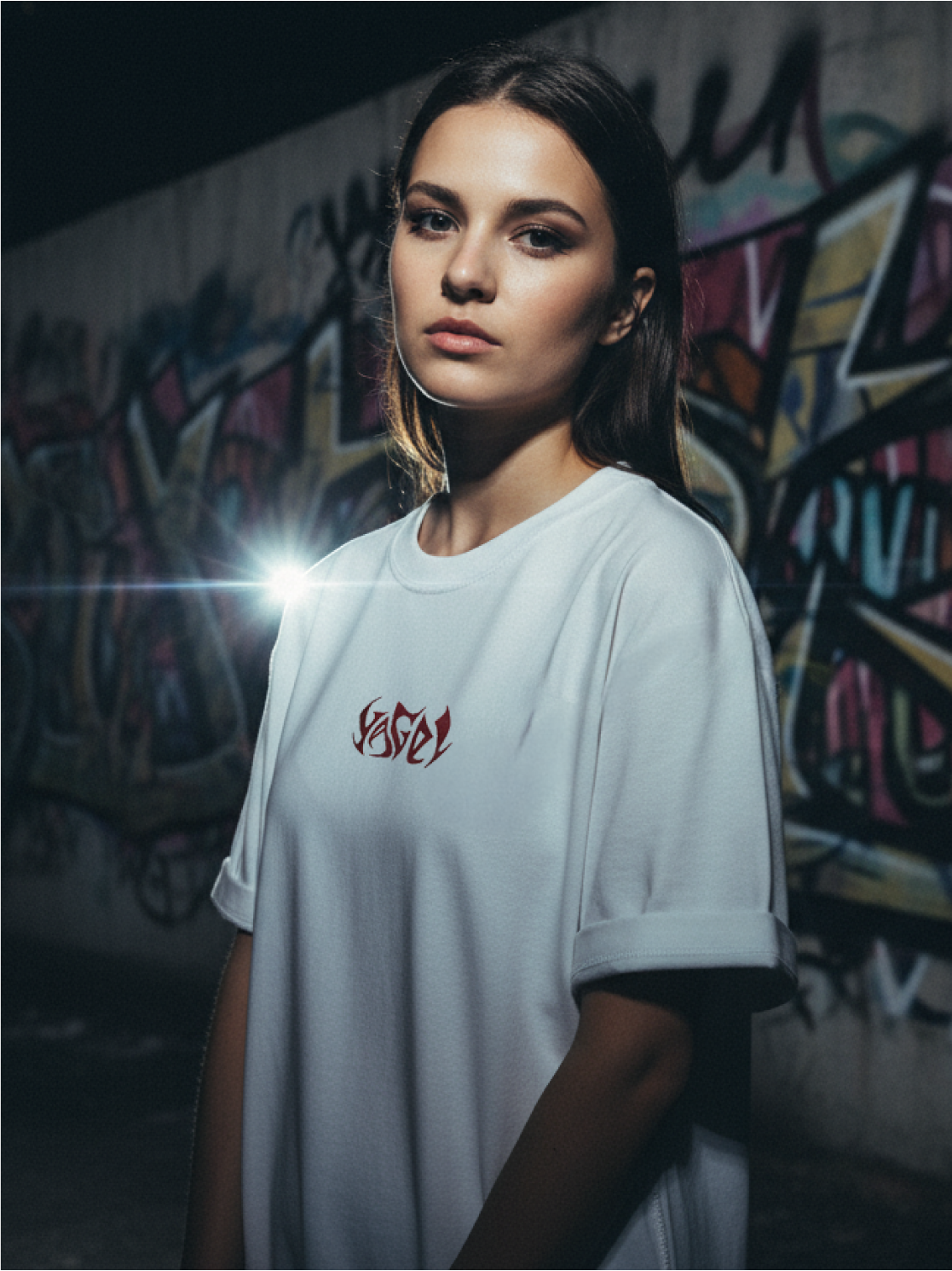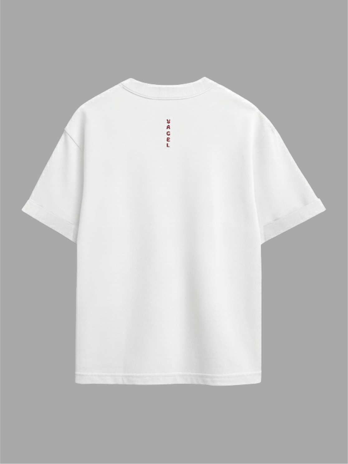 Белая база с акцентом — яркая вышивка красного логотипа YAGEL. Это не просто надпись, а знак, который считывается сразу: сила, движение и энергия улиц.